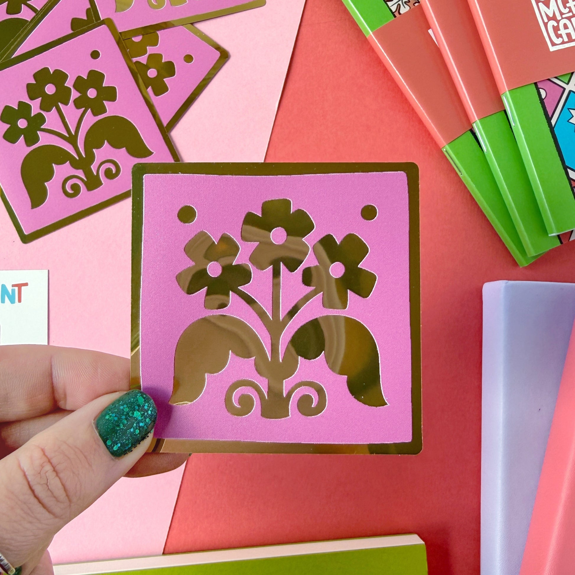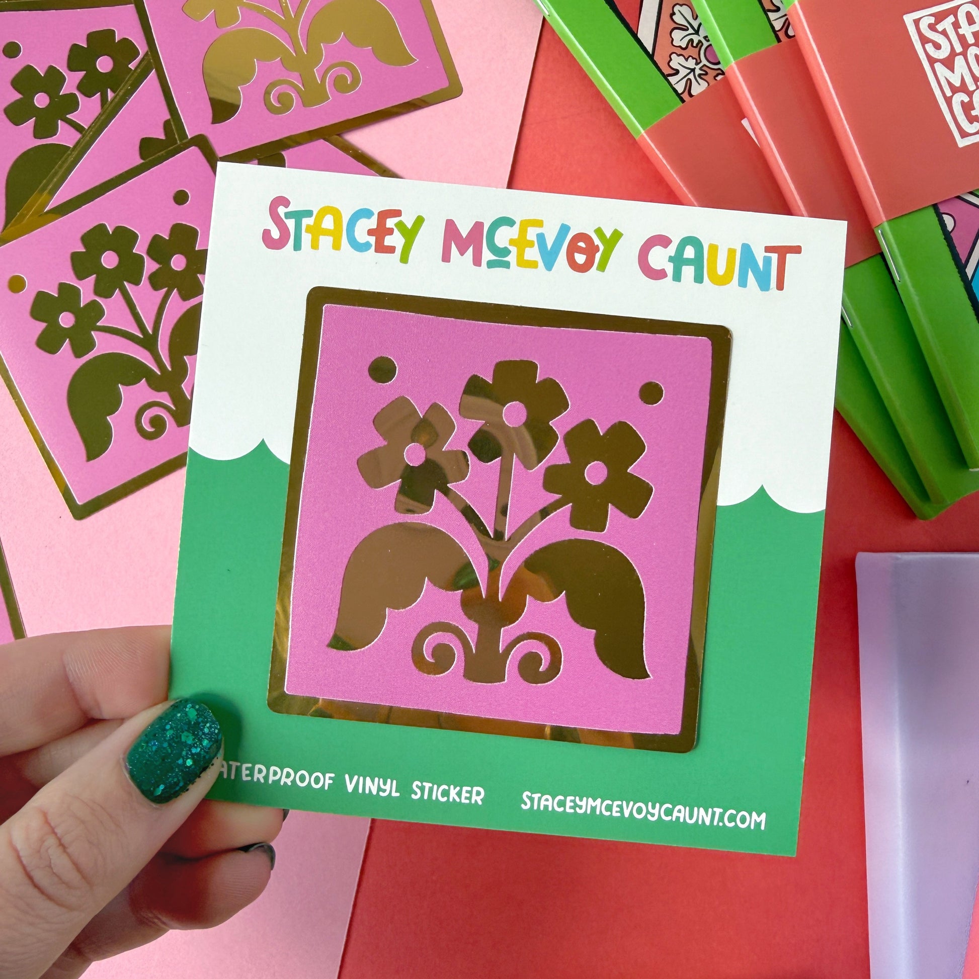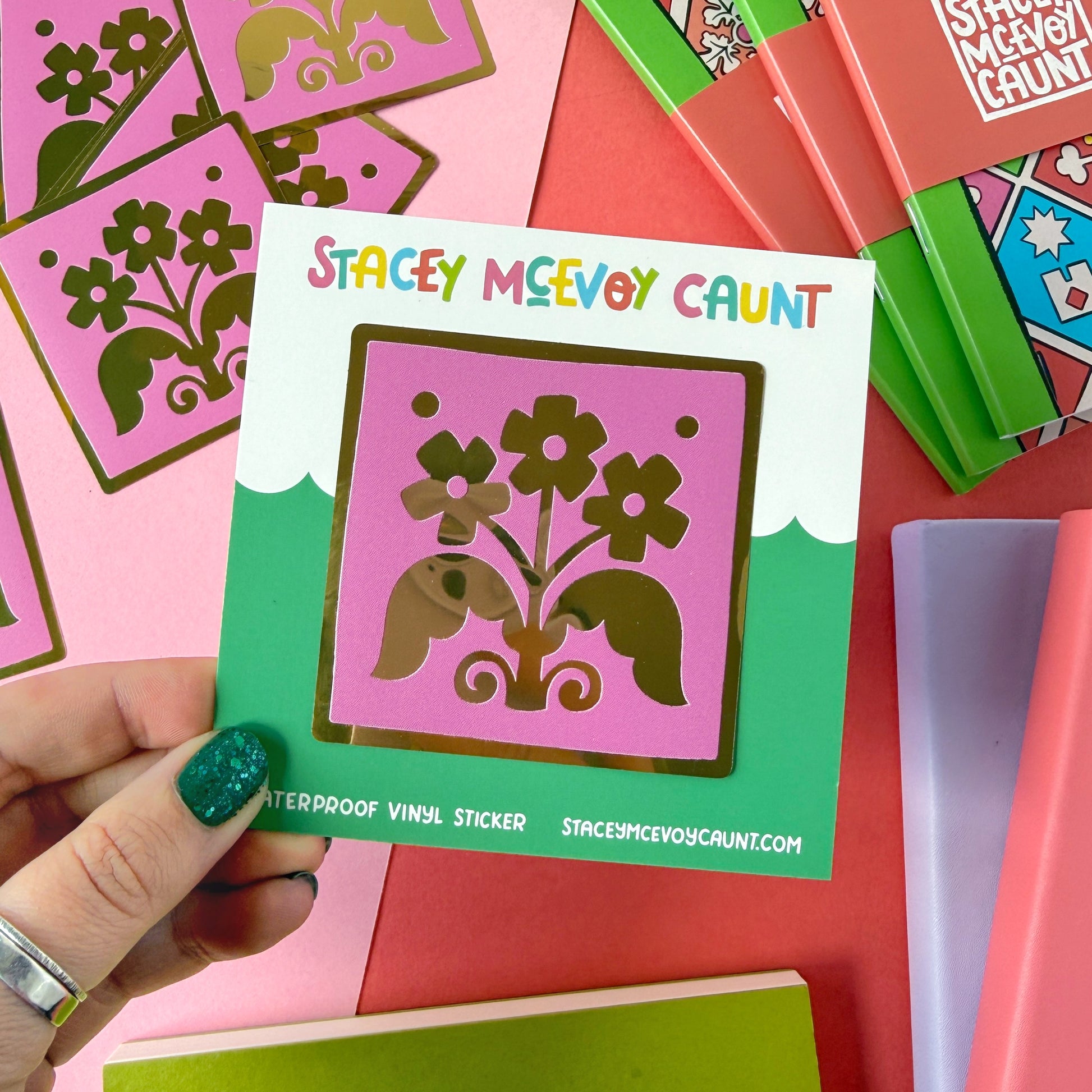 A medieval tile inspired sticker of a floral motif, printed onto luxurious shiny gold foil.