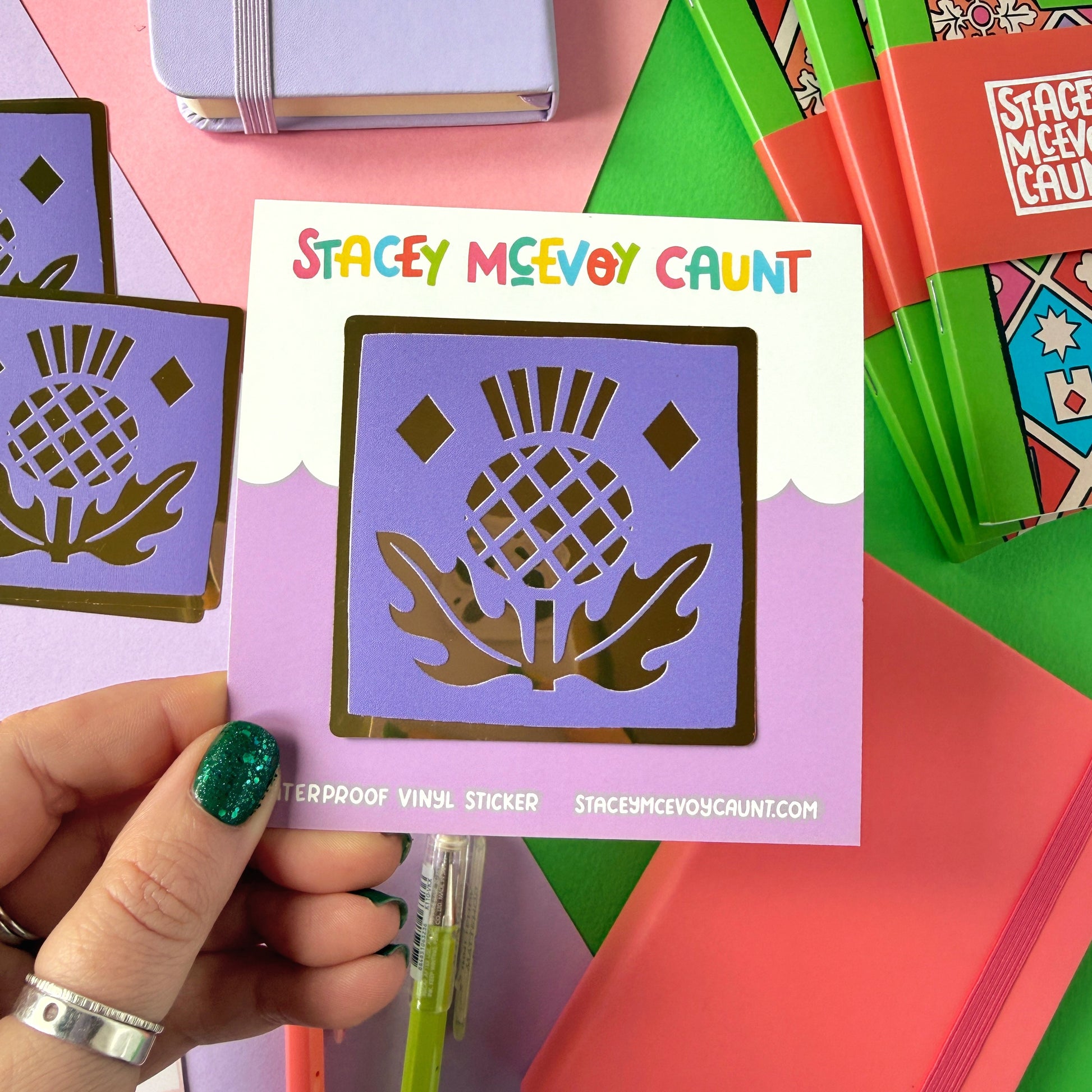 A medieval tile inspired sticker of a thistle motif, printed onto luxurious shiny gold foil.