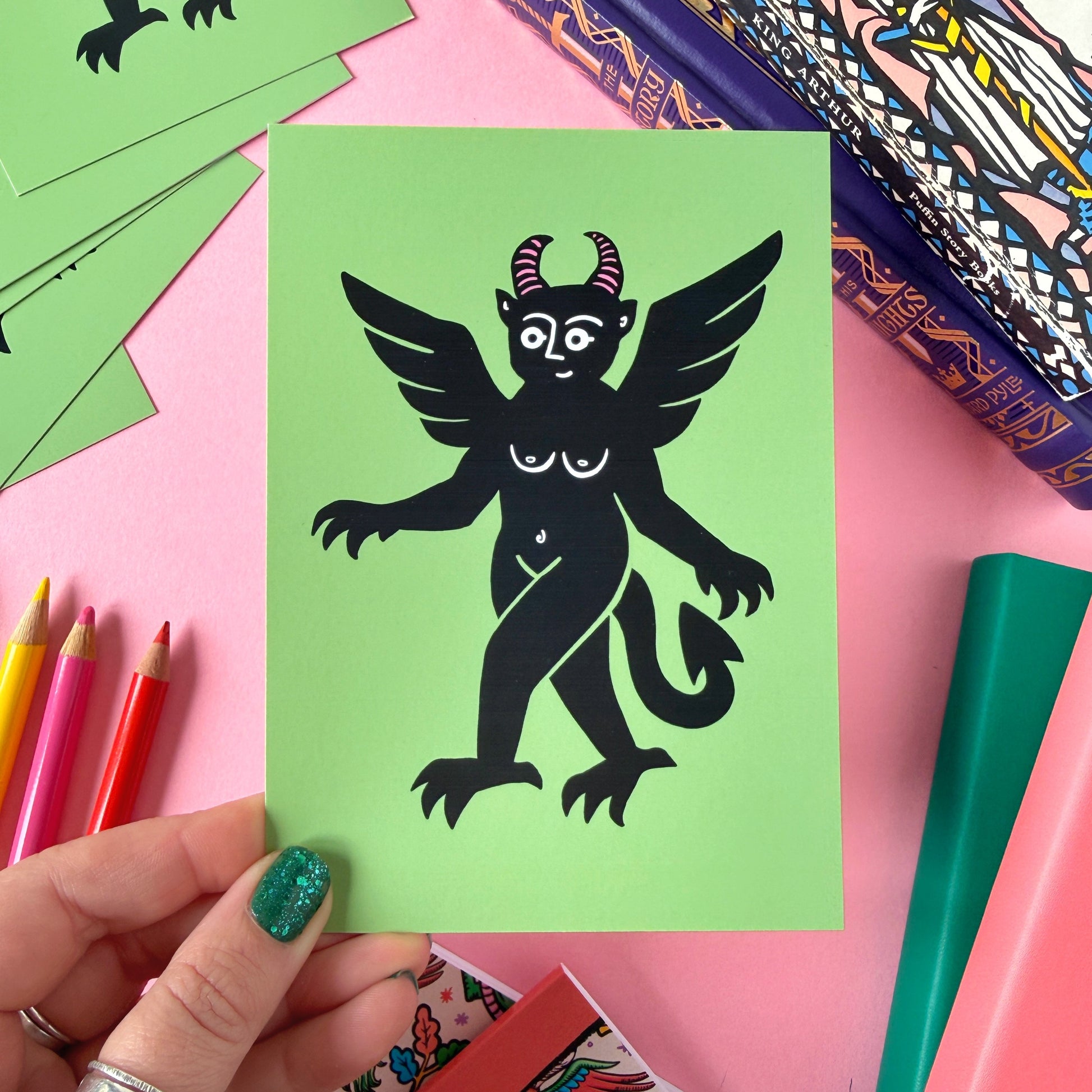 A cute little green boobie devil postcard, inspired by a woodcut from the book The History of Witches and Wizards, originally published in the 18th Century.