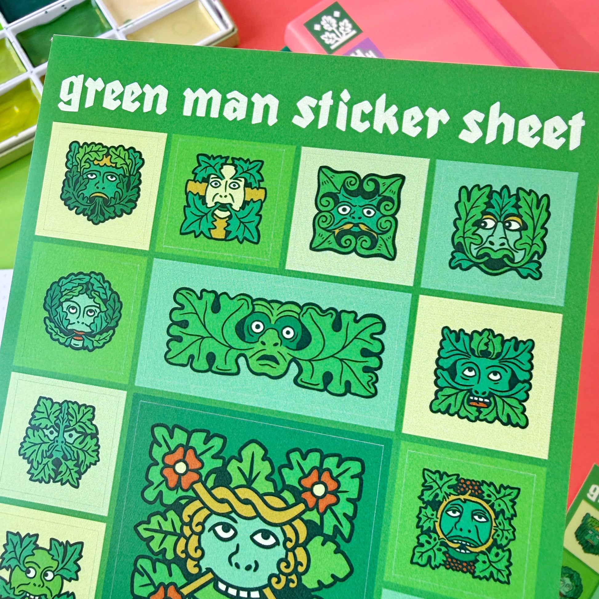 An A6 Sticker sheet, with 16 Green Man stickers, inspired by actual green men found in and round historic buildings across the UK.