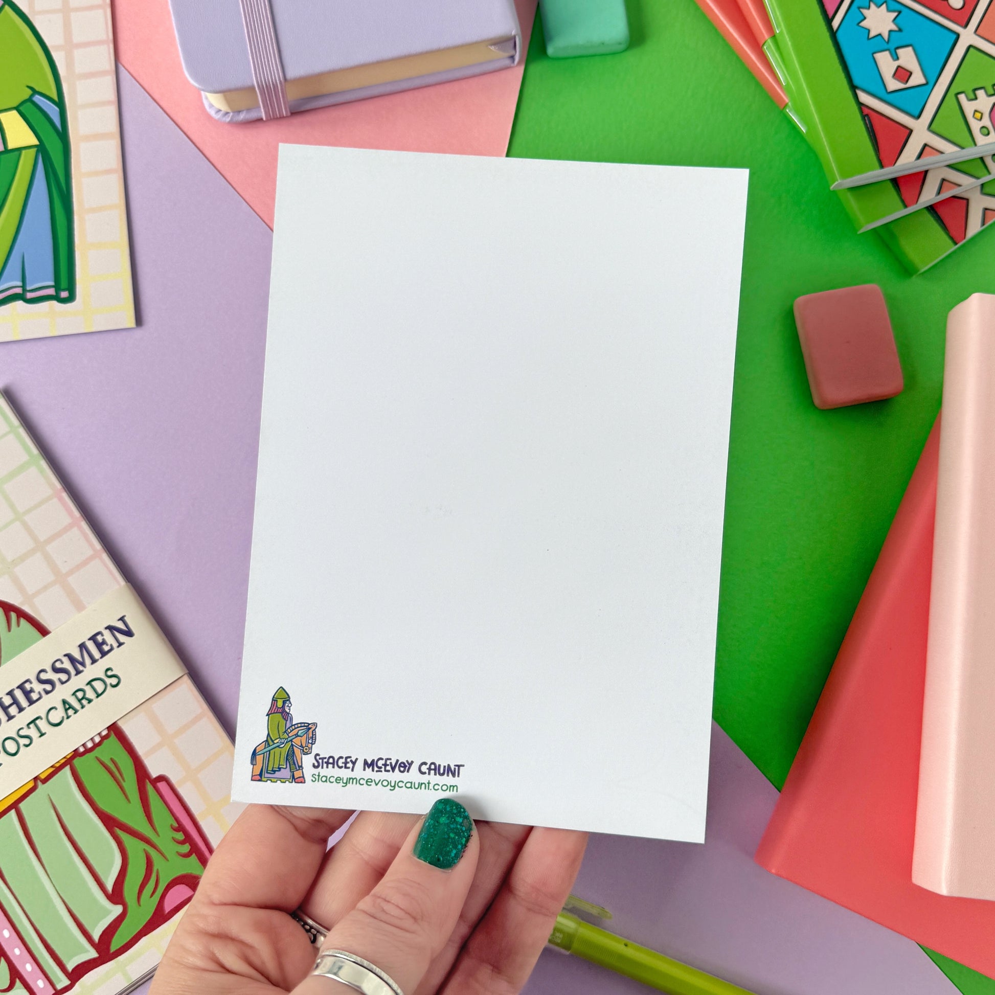 A postcard featuring an illustration of a medieval Knight piece from the Lewis Chessmen.