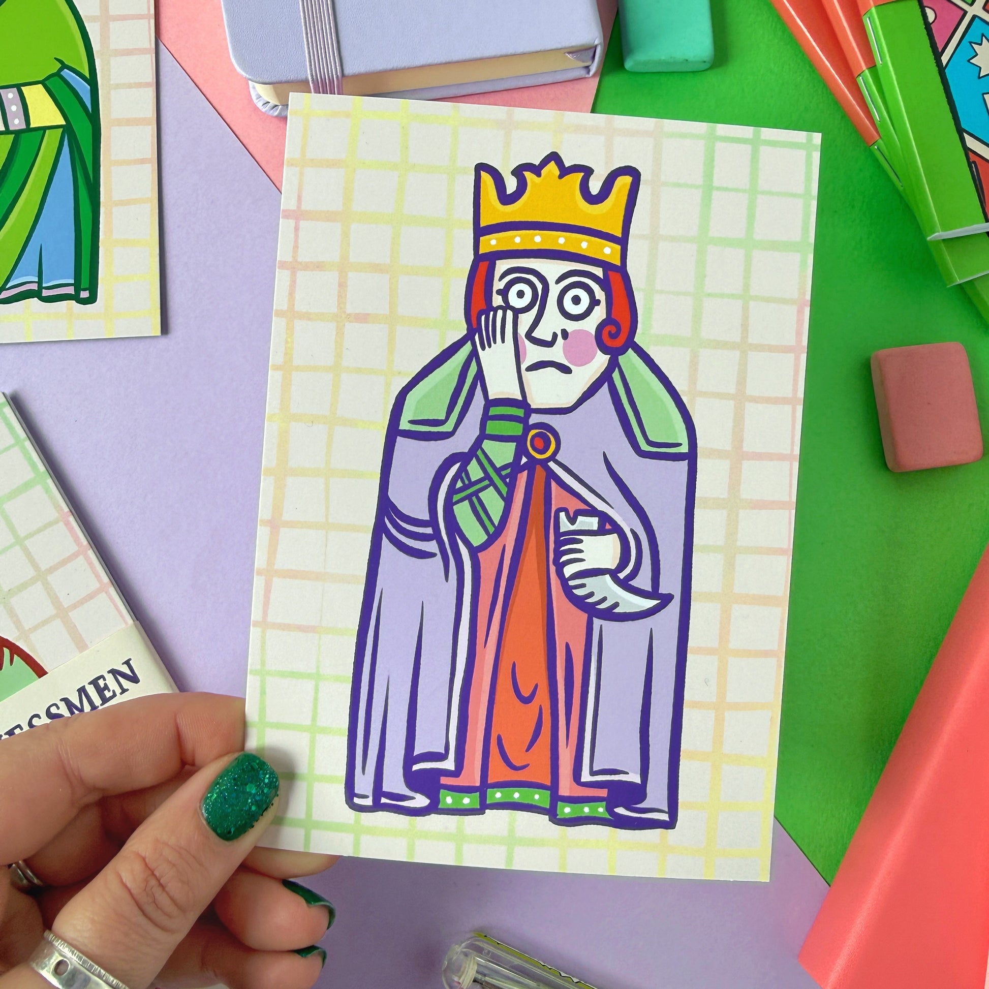 A postcard featuring an illustration of the medieval Queen from the Lewis Chessmen.