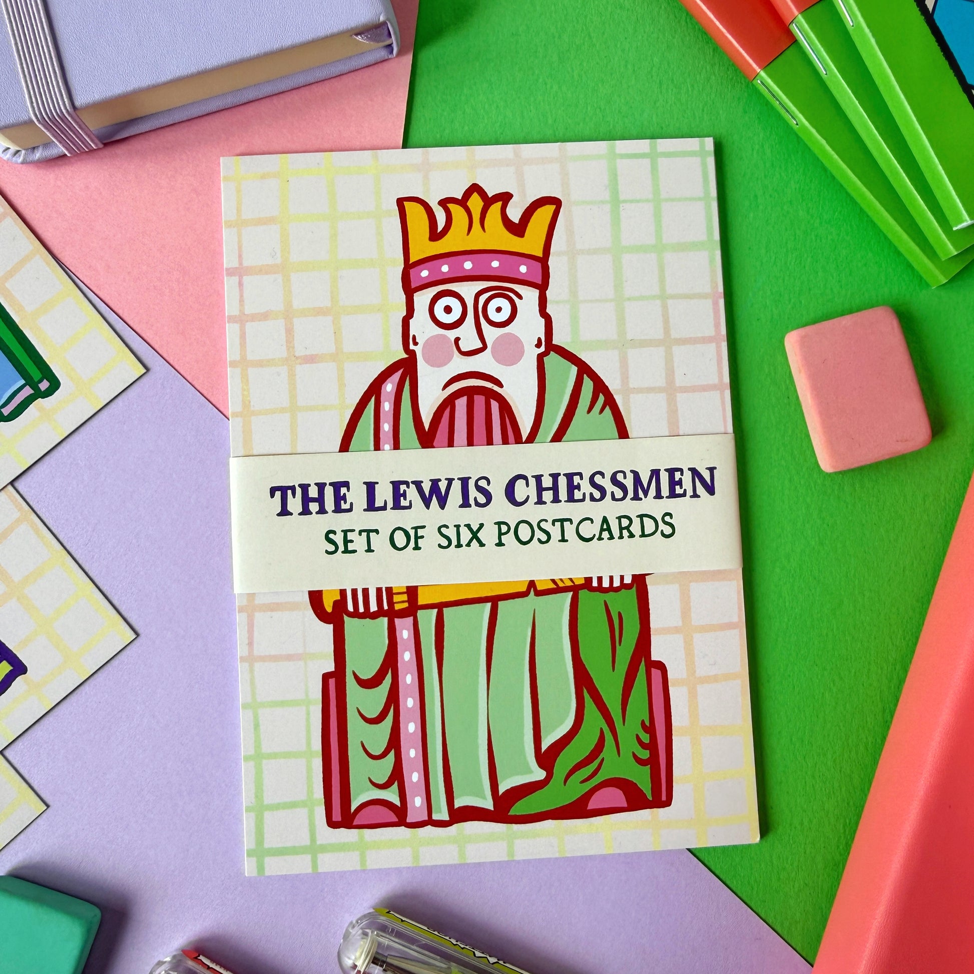 A set of 6 mediedal inspired postcards, each featuring a different illustration of the Lewis Chessmen.