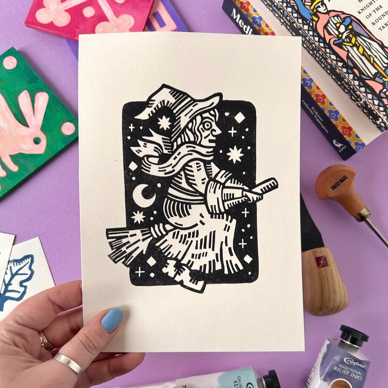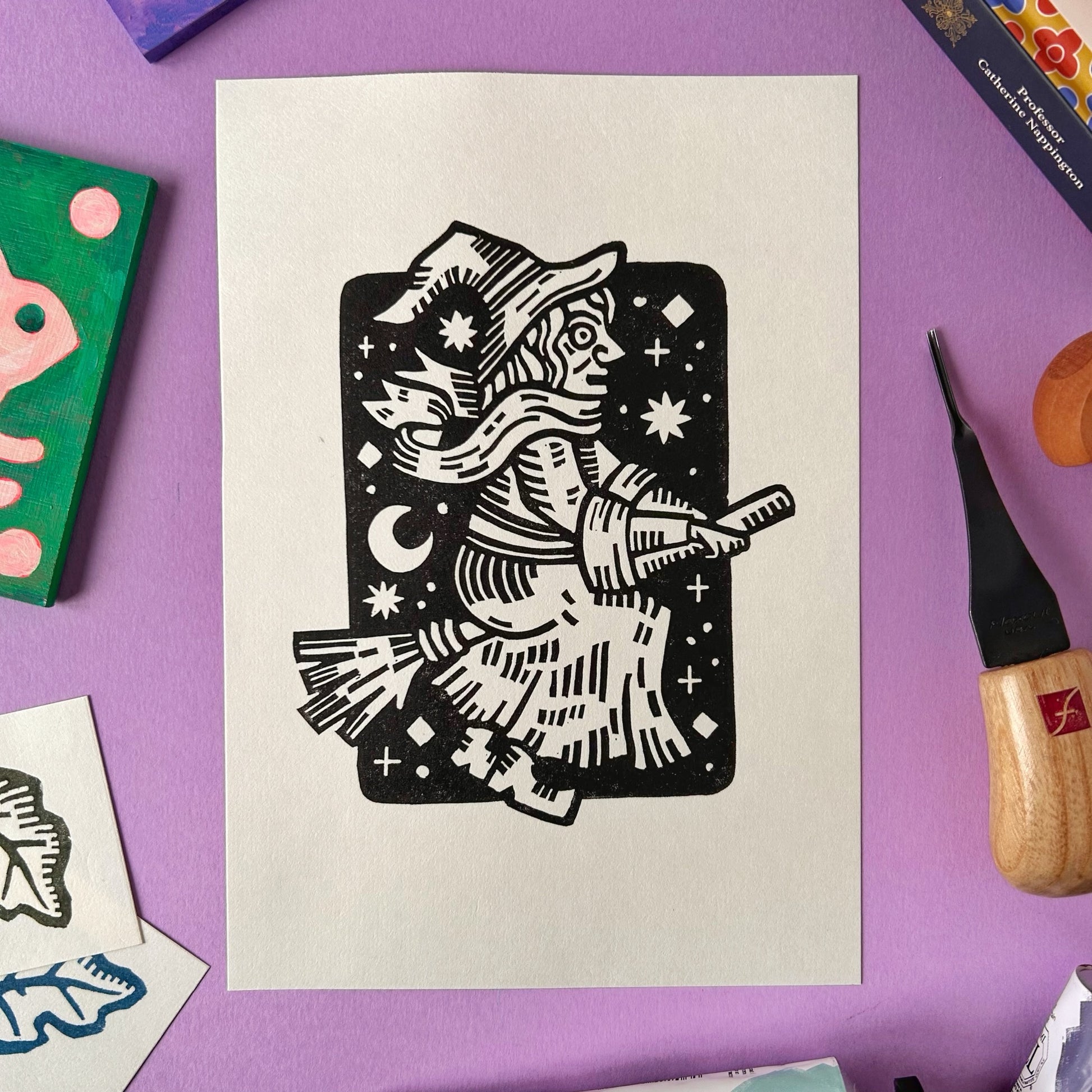 An original lino cut print of a witch on a broomstick, inspired by old woodcuts found in books published around the height of the Witch Trials in the UK in the 16th and 17th centuries.